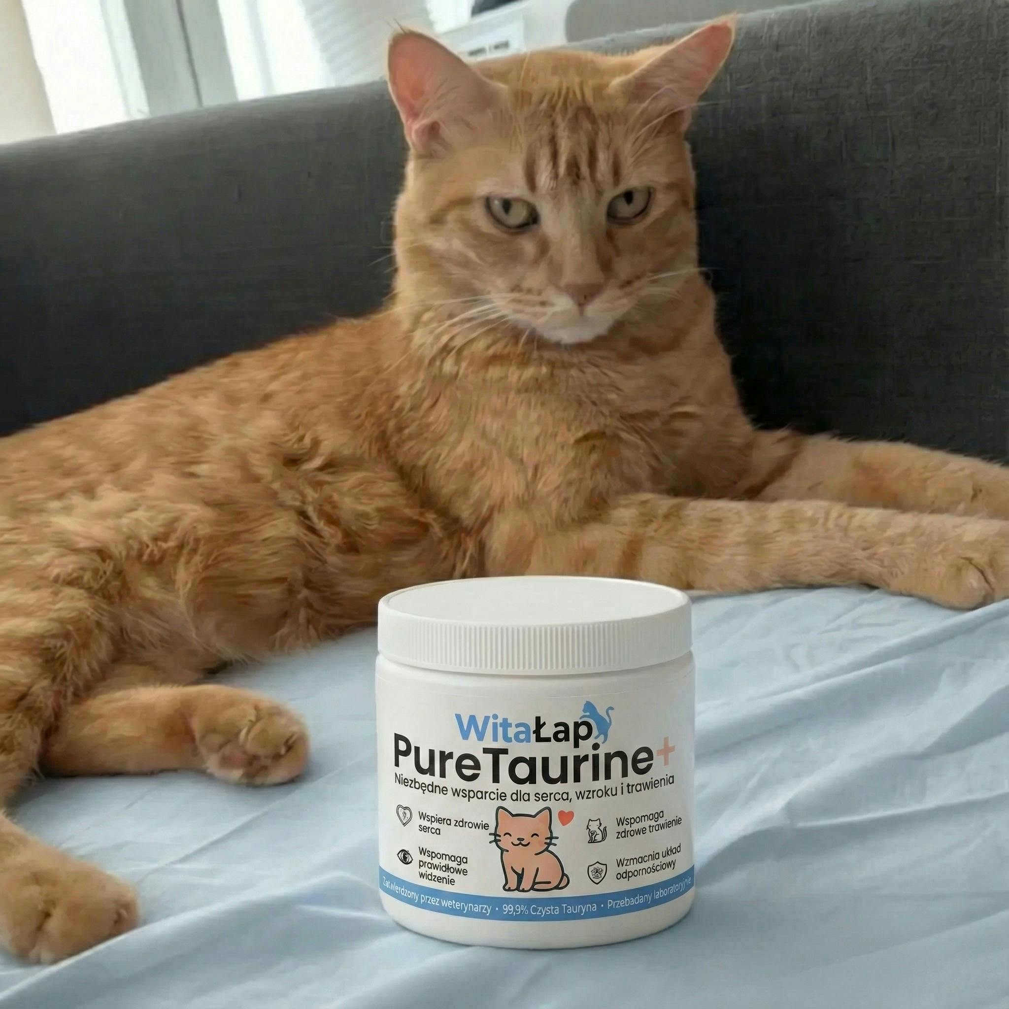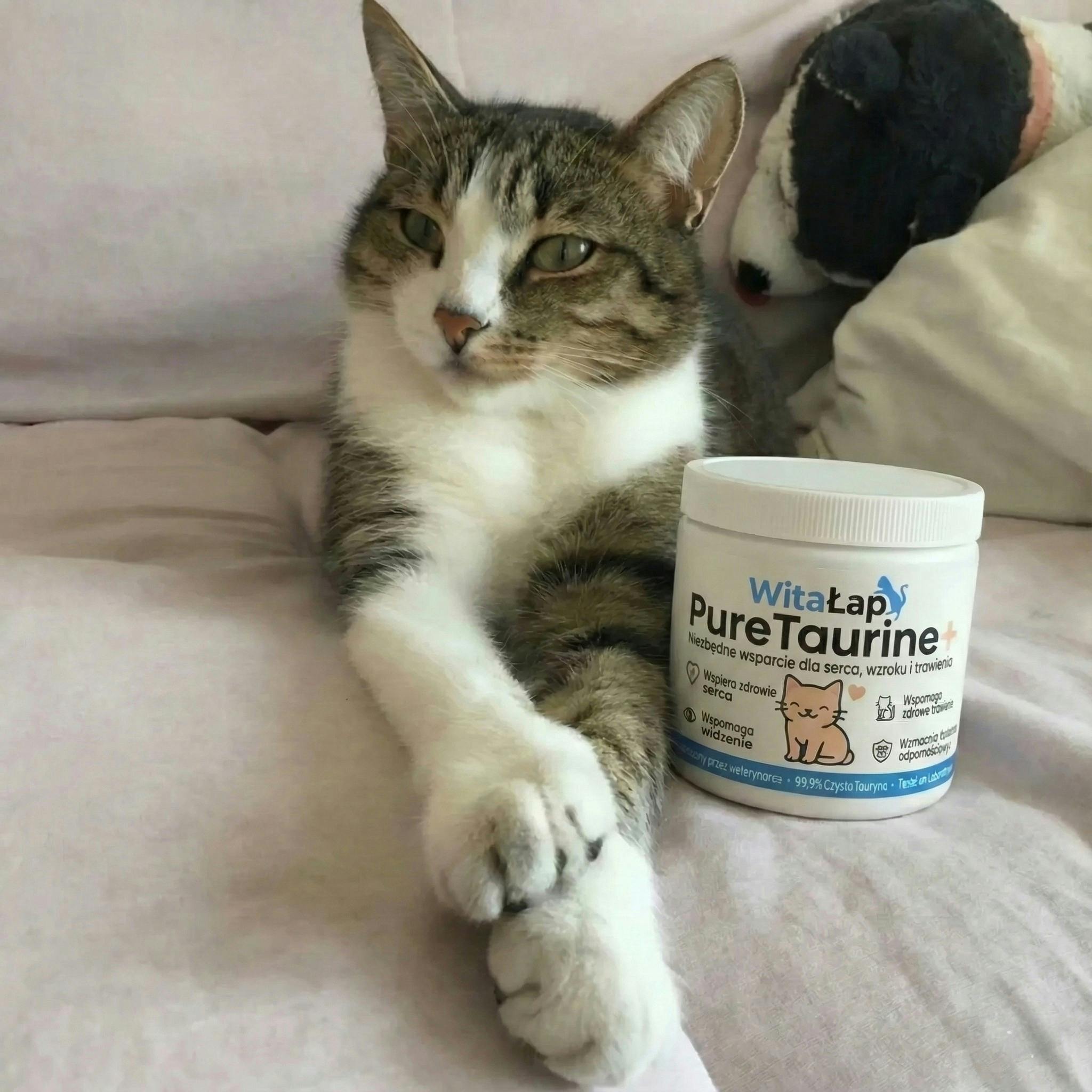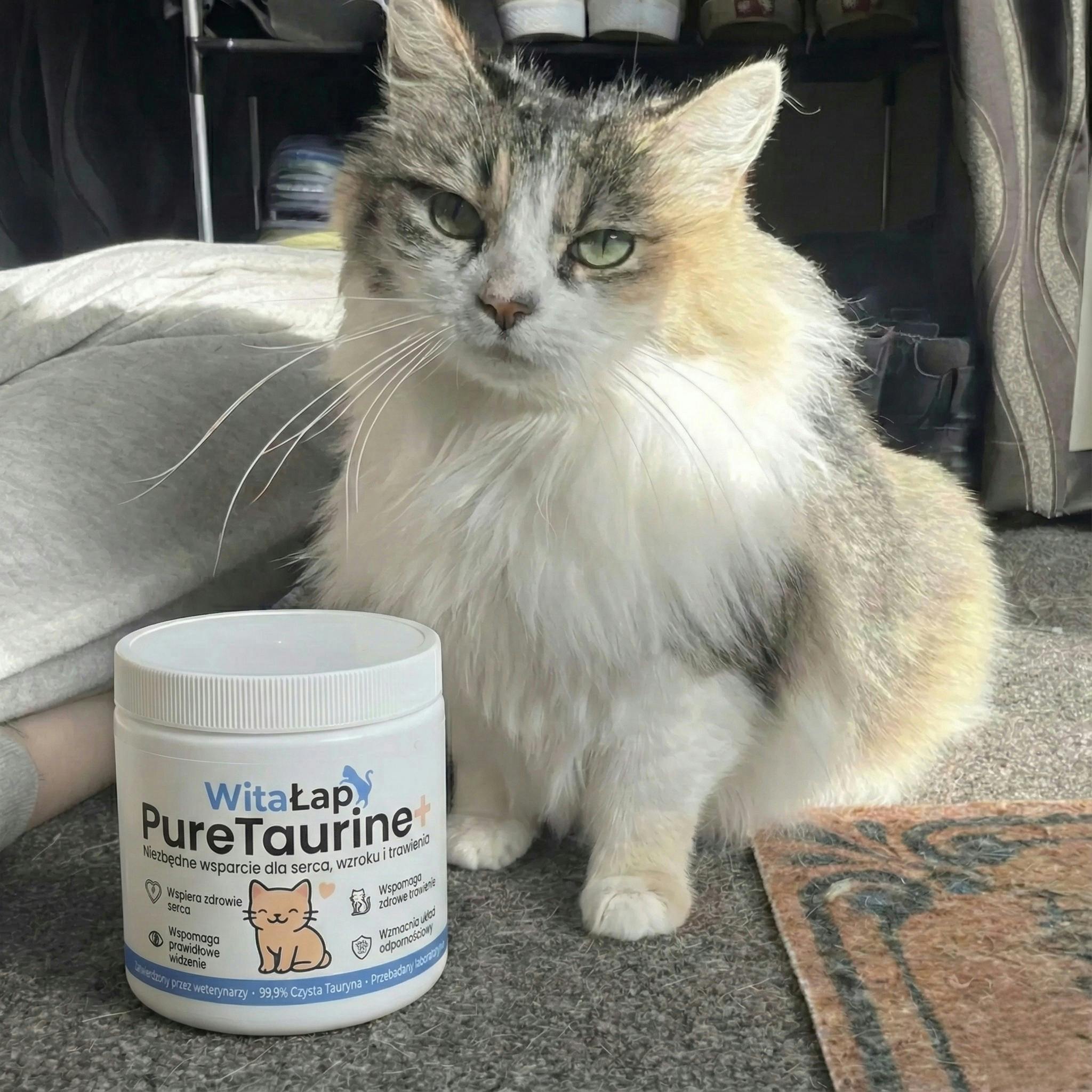 "Mój 14-letni kot ciągle spał. Weterynarz wspomniał o taurynie, by go wzmocnić. Po 3 tygodniach to nie ten sam kot! Znowu się bawi, a jego spojrzenie jest o wiele bystrzejsze."